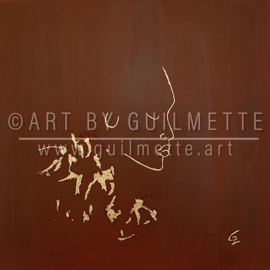 This painting took a long time to finish! It began with leaves I found on the floor on a nice autumn day. I wanted to shape a face with these dead leaves. I worked on it for a few weeks and left it for a few months, as I was not satisfied with the result! After a while, I took the canvas and scratched all the leaves off. Some parts were not willing to be erased… we can see these “leftovers” as the top of a golden robe or a nice jewelry for a fashion design show!