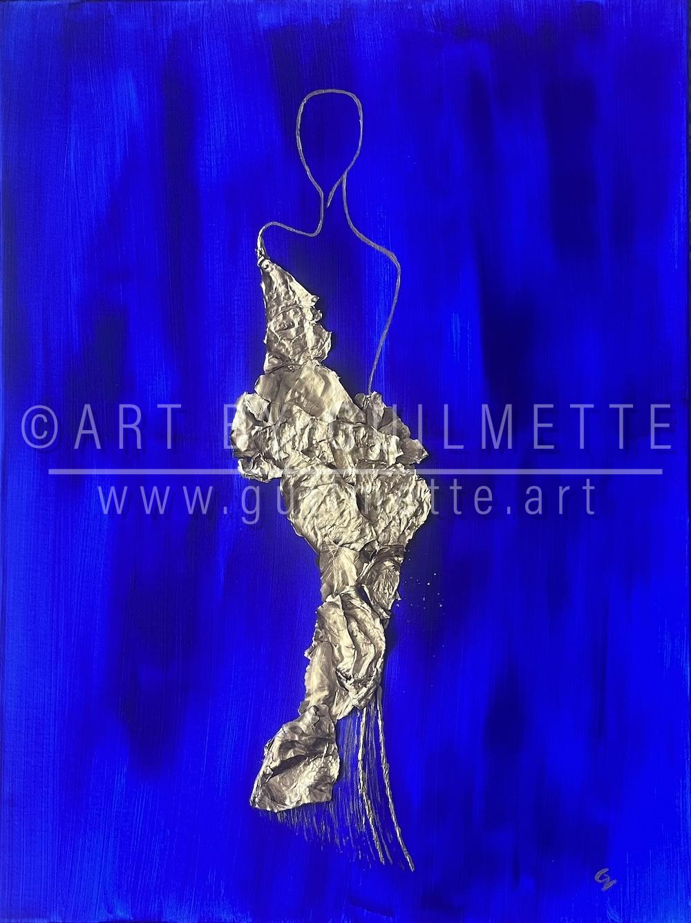 “Gold Lady” is a compelling fusion of minimalism and texture. Set against a deep, electric blue background, the artwork features a graceful female silhouette outlined in a continuous golden line. Her dress, formed from crumpled material, adds a striking three-dimensional quality, suggesting movement and elegance. The contrast between the smooth, rich blue and the textured gold creates visual tension and highlights the figure’s presence. With minimal details, the piece evokes femininity, strength, and sophistication, inviting the viewer to find depth in simplicity.